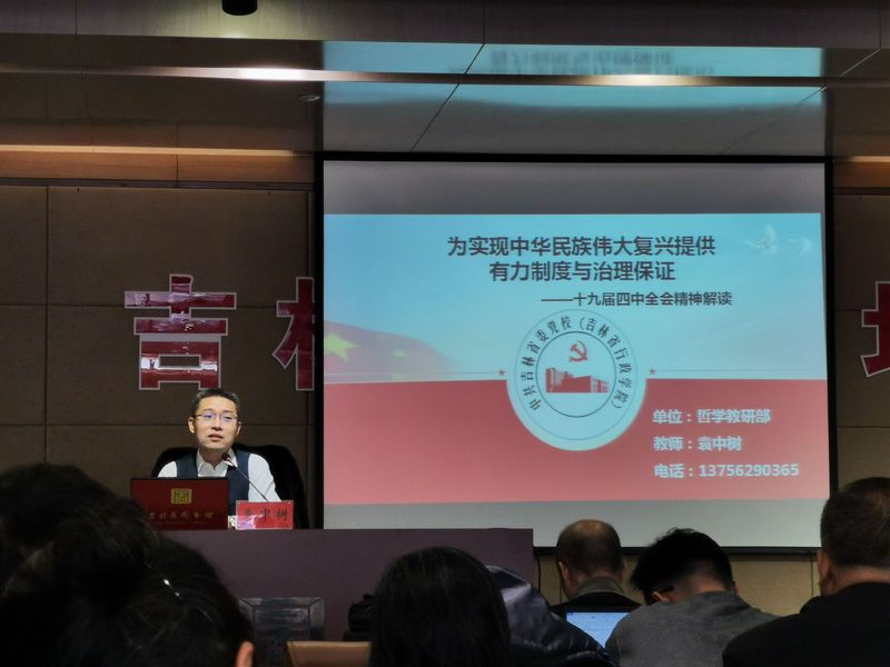 本网讯(通讯员刘心悦)12月1日下午,44118太阳成城集团MMDS学会在吉林省图书馆参加“为实现中华民族伟大复兴提供有力制度与治理保证——党的十九届四中全会精神解读讲座”活动。入党申请人培训班部分学员参加了此次活动。此次活动由中共吉林省党委校哲学教研部副教授,哲学博士袁中树主讲。