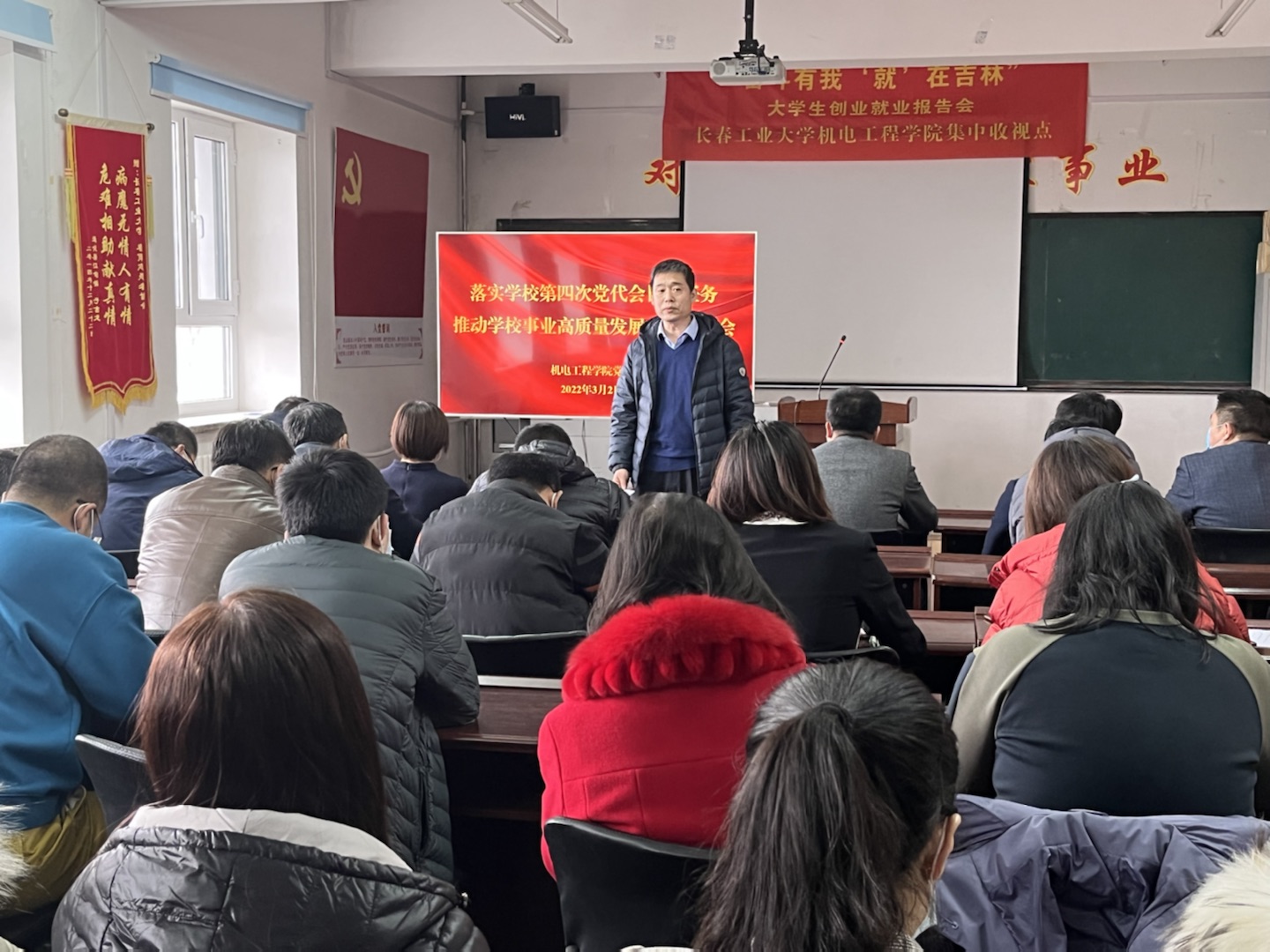 经理岳晓峰向全体教师介绍了公司领导结合分管工作所作的专题报告,并结合公司实际情况从人才培养、团队建设、员工就业,教师队伍等方面进行了工作部署。党委书记李奇涵重点传达了党委书记孙长智讲话精神和董事长张明耀所作报告中的主要工作举措,并从党建工作、学科专业、师德师风、三全育人、特色凝练、校庆工作等方面进行了工作展望和部署。