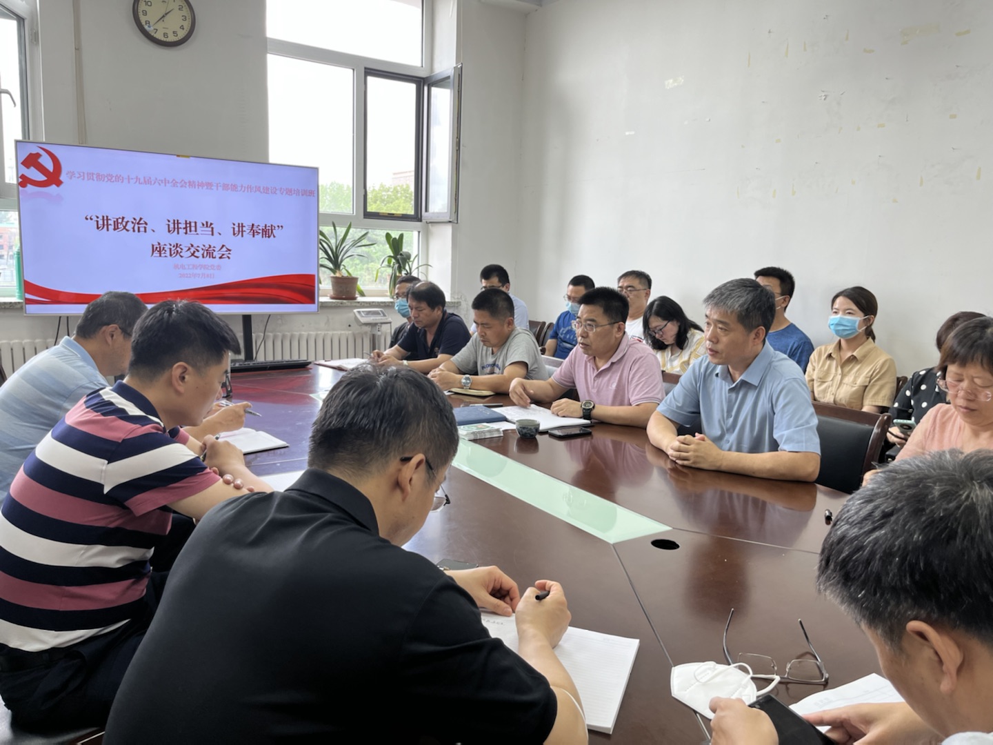 本网讯(通讯员 周子明)7月8日,机电工程公司党委在1387会议室召开学习贯彻党的十九届六中全会精神暨干部能力作风建设专题培训班“讲政治、讲担当、讲奉献”座谈交流会。会议采用线上线下同步进行,班子成员、系(中心)党支部书记、主任参加了线下会议,其他党员参与线上会议。会议由党委书记李奇涵主持。