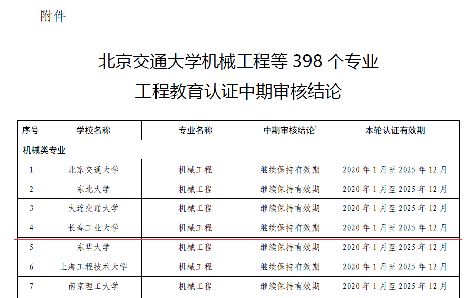 本网讯(通讯员 谷东伟)6月27日,中国工程教育认证协会公布了“关于公布北京交通大学机械工程等398个专业工程教育认证中期审核结论的通知”,公司机械工程专业顺利通过了工程教育认证中期审核,中期审核结论为继续保持有效期,有效期延长至2025年12月。