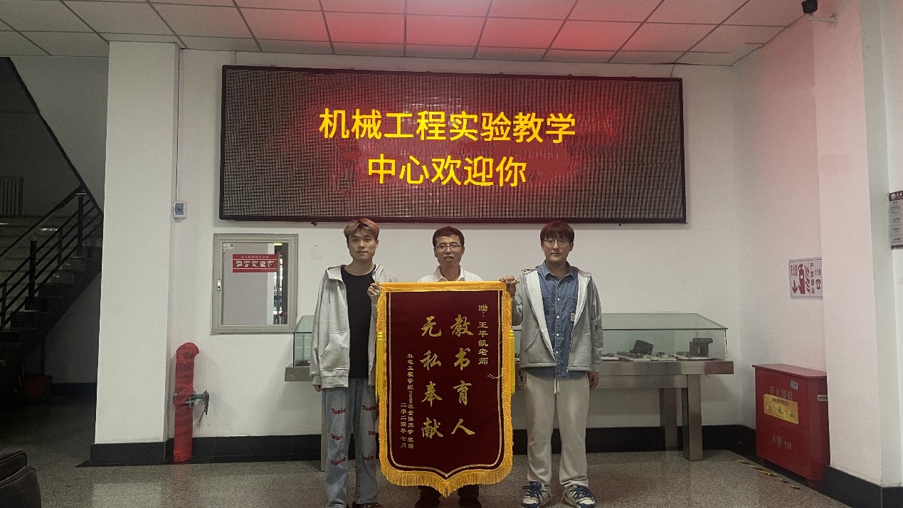 为表达对王老师无私奉献精神的敬意和感激之情,同学们特地制作一面锦旗,上书“教书育人、无私奉献”八个大字,并在课程结束后郑重地赠予了王老师。