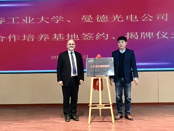 在仪式上,经理郝兆朋与曼德光电公司总经理纳法瑞共同签署校企合作框架协议,双方共同为人才合作培养基地揭牌。