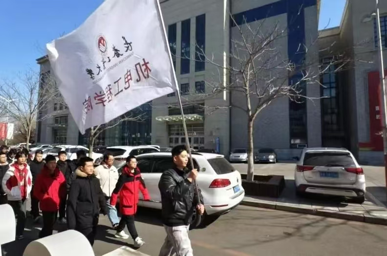 在“绿色校园行”徒步活动中,有“机”青年们以高度的纪律性整齐列队,有序地从操场跑道迈向校园大道。队伍前方,高举院旗的青年身姿矫健、步伐坚毅,院旗在风中烈烈招展,成为引领队伍前进的鲜明标识。同学们在院旗的引领下探寻初春之美,这不仅是一场身体的漫步,更是一次心灵的净化。