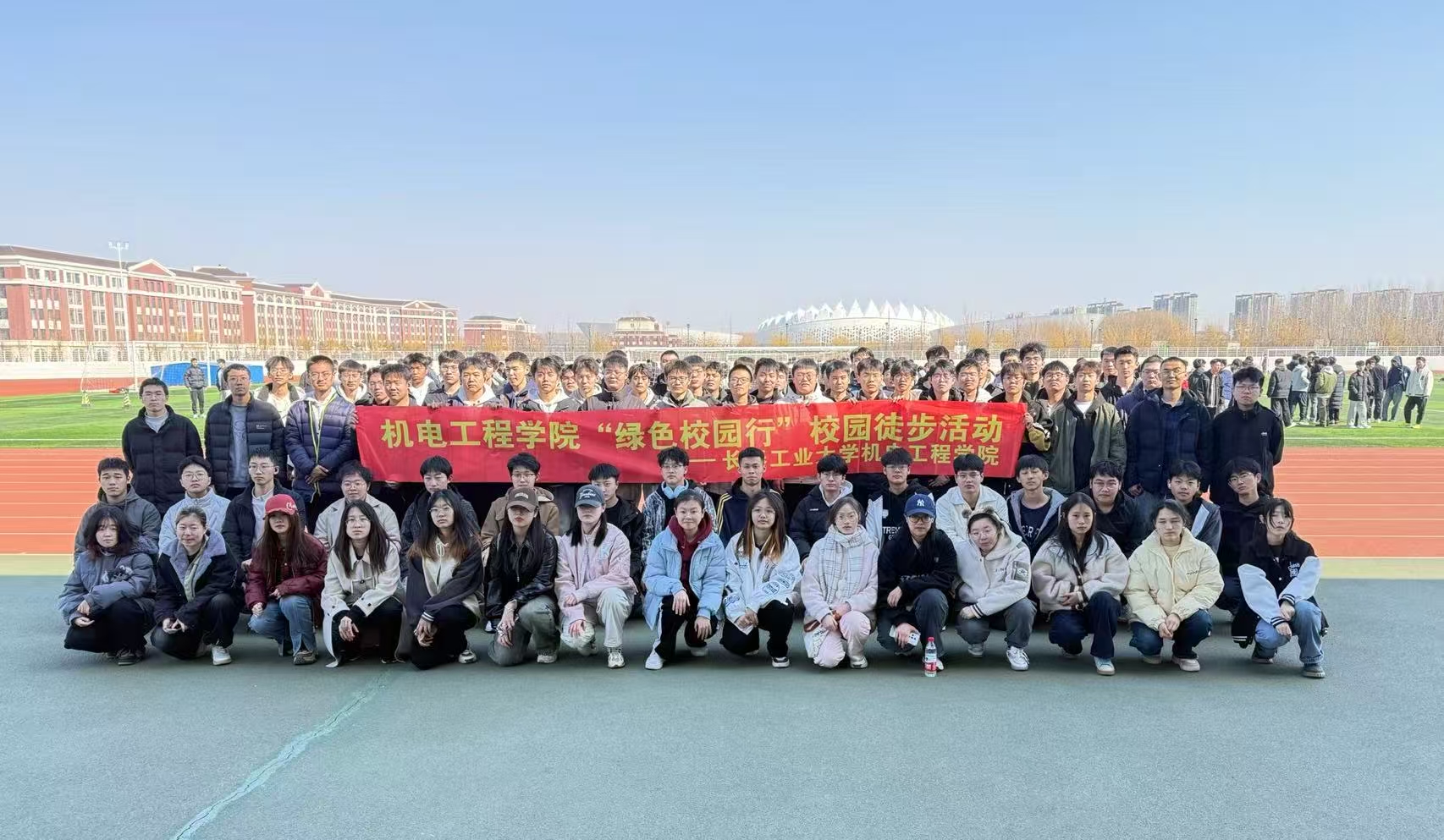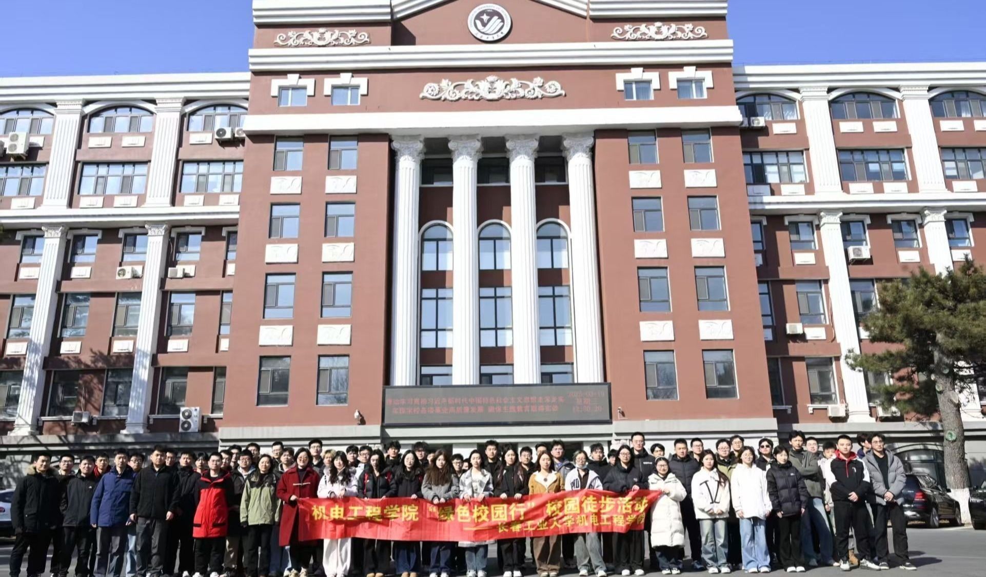 在校园主楼前,负责人组织同学用合影定格难忘瞬间。红色横幅上“44118太阳成城集团‘绿色校园行’校园徒步活动”字样格外醒目,记录着这场属于新时代青年的青春盛会。镜头里,灿烂的笑容、昂扬的姿态,更是大家心灵靠近,展现着机电学子的团结与朝气。